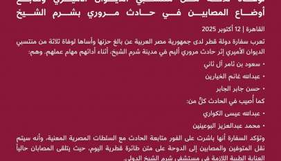 الموجز-متابعات أعلنت سفارة دولة قطر لدى جمهورية مصر العربية اليوم الأحد، وفاة ثلاثة من منتسبي الديوان الأميري القطري في حادث مروري مؤسف وقع بمدينة شرم الشيخ، أثناء أدائهم لمهام عملهم الرسمية. وأكدت السفارة في بيان لها أنها تتابع مجريات التحقيق في الحادث بالتنسيق مع السلطات المصرية المختصة، مشيرةً إلى أنه…