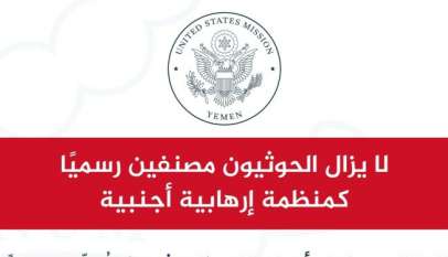 السفارة الأمريكية : لا يزال الحوثيون مصنفين رسمياً كمنظمة إرهابية أجنبية