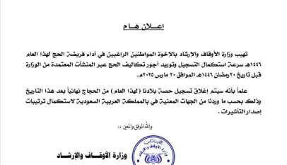 وزارة الأوقاف والإرشاد تعلن موعد إغلاق تسجيل الحجاج لهذا العام