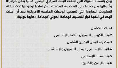 عاجل : البنك المركزي يعلن اسماء 8 بنوك قررت نقل مراكزها الرئيسية من صنعاء إلى عدن تفاديا لوقوعها تحت طائلة العقوبات الأميركية
