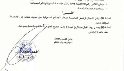 أكمل القراءة »محافظ البنك المركزي يصدر قرارًا بنقل المقر الرئيسي لمؤسسة ضمان الودائع من صنعاء إلى عدن