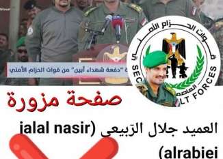 الحزام الأمني ينفي وجود صفحة رسمية للعميد الربيعي على منصة الفيس