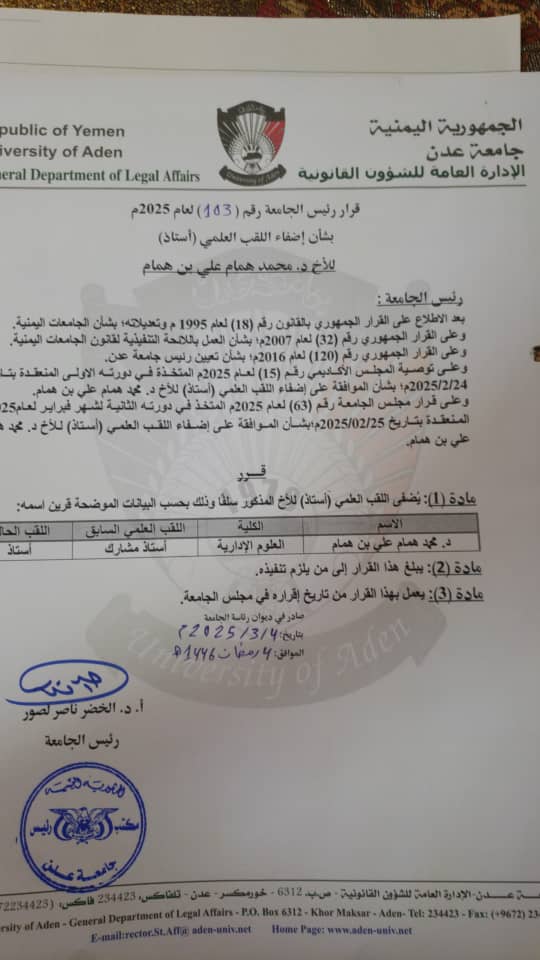 منحت جامعة عدن الدكتور محمد همام علي بن همام درجة الأستاذية ، وذلك بناءً على قرار رئاسة جامعة عدن برقم ( 103) و الصادر 14 مارس 2025م .