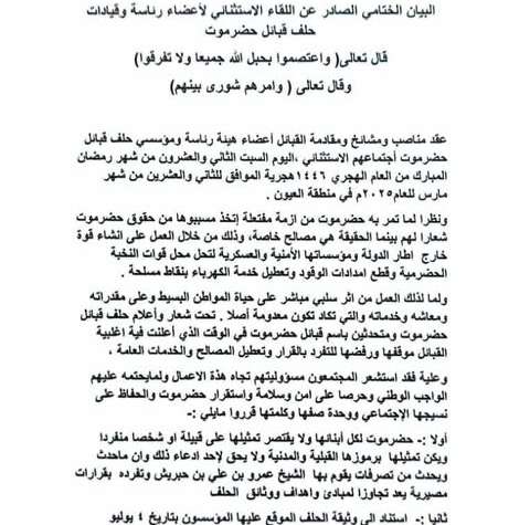 بيان ختامي: للاجتماع الاستثنائي لحلف قبائل حضرموت في العيون يسحب الثقة من الشيخ عمرو بن حبريش