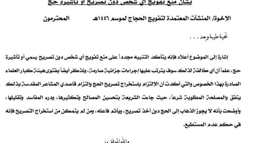 واكدت الوزارة في تعميم موجه إلى المنشآت المعتمدة لتفويج الحجاج لموسم ١٤٤٦هـ، أن أي مخالفة لذلك سوف يترتب عليها إجراءات جزائية صارمة..مشيرة إلى فتوى هيئة كبار العلماء الصادرة بهذا الخصوص والتي أكدت أن الالتزام باستخراج تصريح الحج والتزام قاصدي المشاعر المقدسة بذلك يتفق مع المصلحة المطلوبة شرعاً .