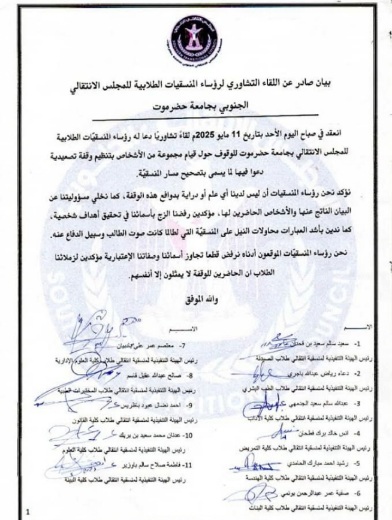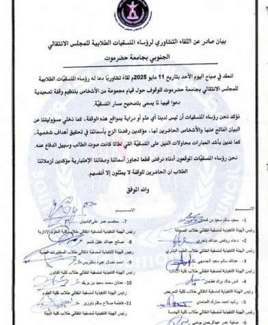 رؤساء منسقيات الانتقالي بجامعة حضرموت يوضحون موقفهم من وقفة “تصحيح المسار” (وثيقة)