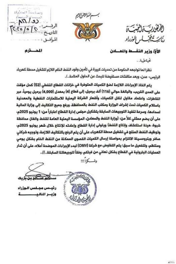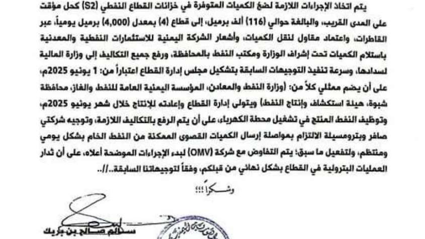 كما قضت التوجيهات برفع جميع التكاليف إلى وزارة المالية لتسديدها، مع سرعة تشكيل مجلس إدارة للقطاع اعتبارا من 1 يونيو 2025، يضم ممثلين عن وزارة النفط والمعادن، المؤسسة اليمنية العامة للنفط والغاز، محافظة شبوة، وهيئة استكشاف وإنتاج النفط.