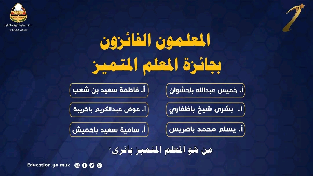 لعدد من المعلمين والمعلمات التربويين ممن نالوا شرف جائزة المعلم المتميز للعام 2025/2024م وحققوها بجدارة وتميز وتألق وفي تصريح أدلى به عمشوش ظهر اليوم لمنصات الإعلام التربوي بالمديرية اوضح انه شي يثلج الصدر ويرفع الرأس بما تحقق من إنجاز آخر يضاف لانجازات التربية والتعليم بالمديرية وهو فوز عدد من التربويين بجائزة المعلم المتميز على مستوى المحافظة وهي جائزة تمنحها إدارة مكتب التربية بالمحافظة للمتميزين في أداء عملهم ومايقدمونه من عطاء تربوي جميل مؤكدا ان مديرية غيل باوزير حققت مانسبته 50% من الفائزين على مستوى محافظة حضرموت من هذه الجائزة القيمة الثمينة /جائزة المعلم المتميز/والذي يعد شرفاً وتاجاً لكل منتسبي قطاع التربية والتعليم بالمديرية بوصفها جائزة