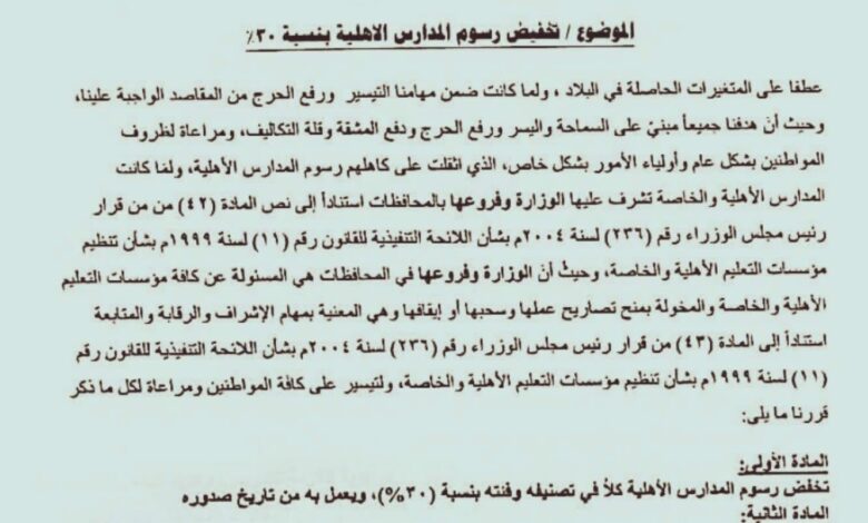 وأوضح المكتب، في تعميم رسمي، أن القرار يستند إلى نص المادة (42) من قرار رئيس مجلس الوزراء رقم (94) بشأن اللائحة التنفيذية للقانون رقم (11) لسنة 1999م الخاص بتنظيم مؤسسات التعليم الأهلي والخاص، مؤكداً أن الهدف من القرار هو التيسير على المواطنين ورفع الأعباء المالية عن أولياء الأمور.
