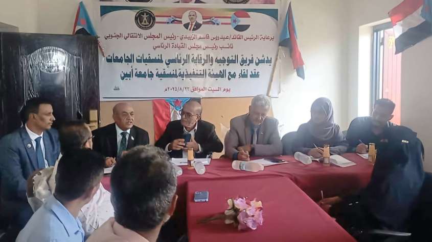 فريق التوجيه والرقابة الرئاسي يعقد لقاءً مع الهيئة التنفيذية لمنسقية المجلس الانتقالي بجامعة أبين