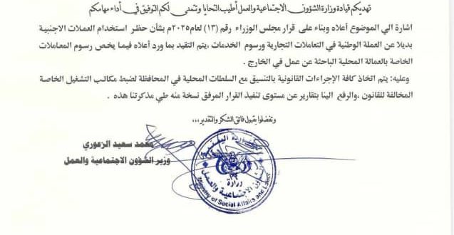 وأكد التعميم الصادر عن معالي وزير الشؤون الاجتماعية والعمل الدكتور محمد سعيد الزعوري، ضرورة اتخاذ الإجراءات القانونية بحق مكاتب التشغيل المخالفة للقانون، بالتنسيق مع السلطات المحلية، مع رفع تقارير دورية حول مستوى تنفيذ قرار مجلس الوزراء رقم (13) لعام 2025، القاضي بحظر التعامل بالعملات الأجنبية في المعاملات التجارية ورسوم الخدمات.