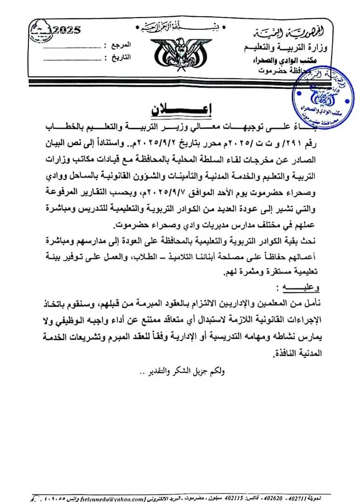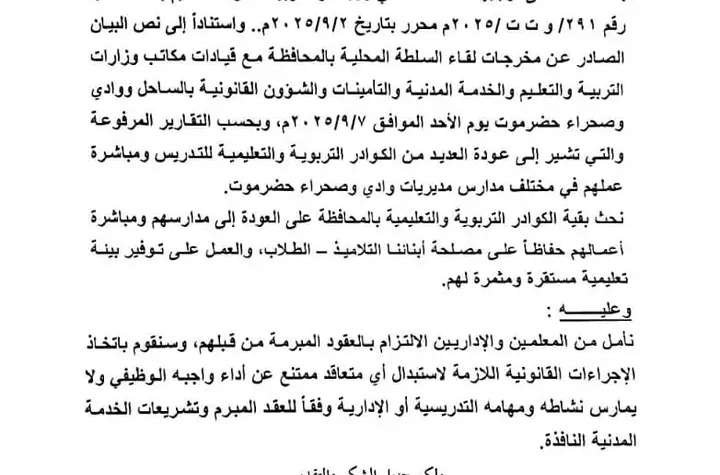 حضرموت: دعوة للمعلمين للالتزام بالدوام وتهددات بإجراءات ضد المتخلفين