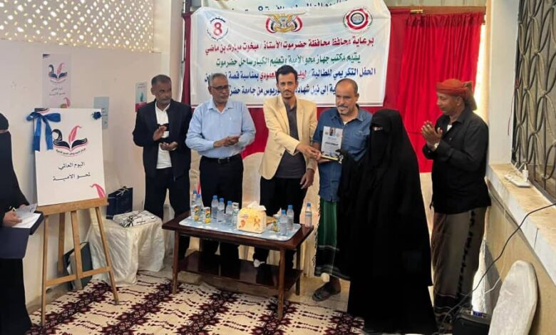 كرم وكيل محافظة حضرموت الأستاذ حسن سالم الجيلاني، صباح الإثنين بمركز بيت العيدروس بمدينة المكلا، الطالبة ليلى أبوبكر العمودي، خريجة محو الأمية، بمناسبة نيلها درجة البكالوريوس في تخصص الخدمة الاجتماعية بكلية البنات – جامعة حضرموت، وذالك برفقة المدير العام لجهاز محو الأمية وتعليم الكبار بساحل حضرموت الأستاذ السادات صالح العسل، وبالتزامن مع اليوم العالمي لمحو الأمية الموافق 8 سبتمبر.