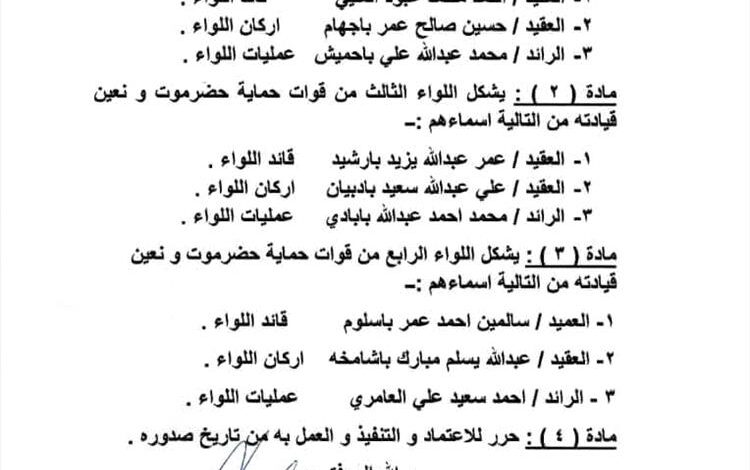 القرار تضمن تشكيل اللواءين الثاني والثالث والرابع، وتعيين قادة وأركان وعمليات لكل لواء، بينهم ضباط برتبة عميد وعقيد ورائد .