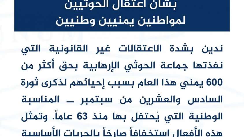 أدانت السفارة الأميركية لدى اليمن، عمليات الاختطاف التي نفذتها مليشيا الحوثي الإرهابية بحق أكثر من 600 مواطن يمني خلال العام الجاري، على خلفية مشاركتهم في فعاليات إحياء الذكرى الـ63 لثورة الـ26 سبتمبر.