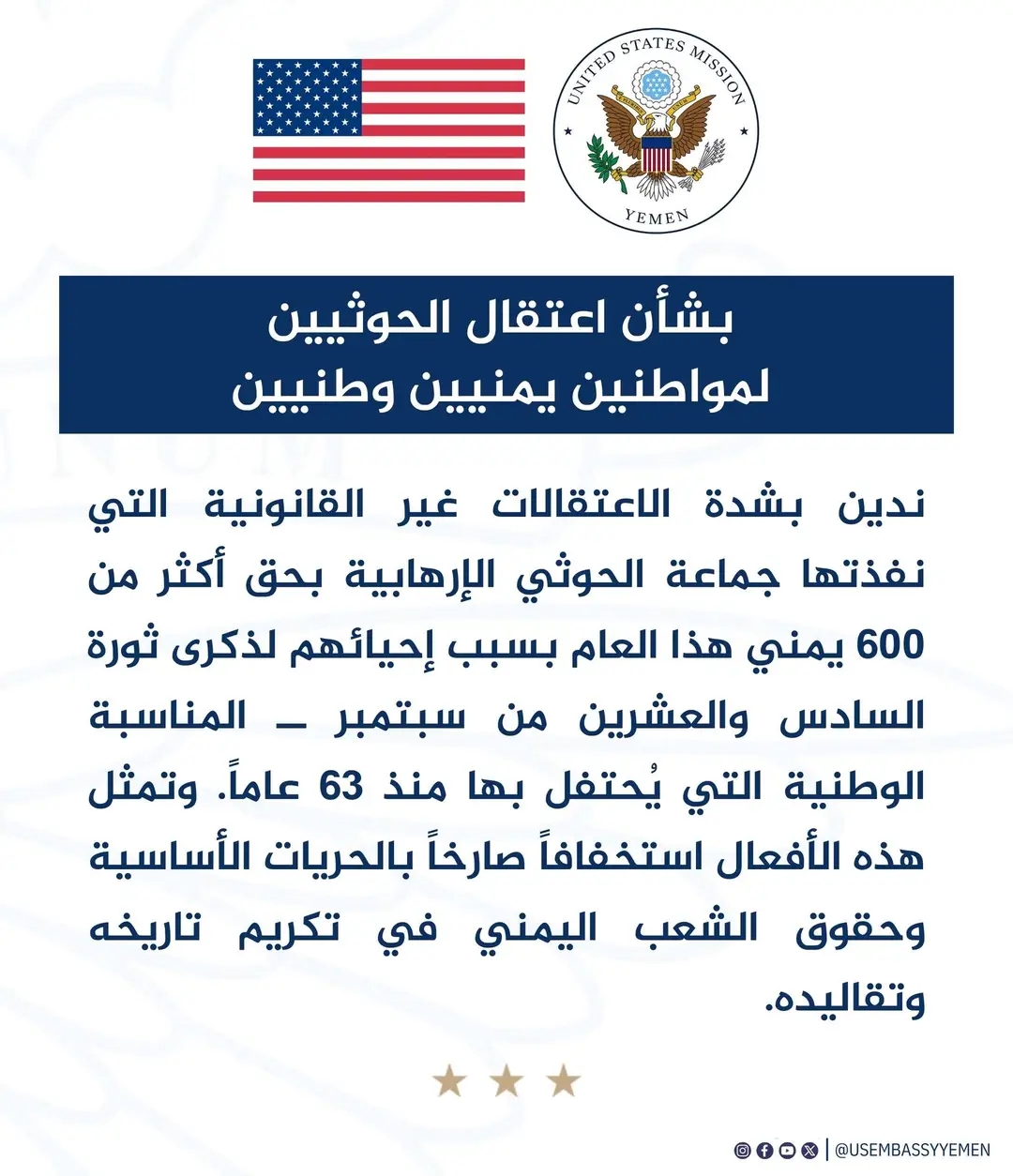 السفارة الأميركية تدين اختطاف الحوثيين لأكثر من 600 مواطن بسبب إحيائهم لثورة 26 سبتمبر