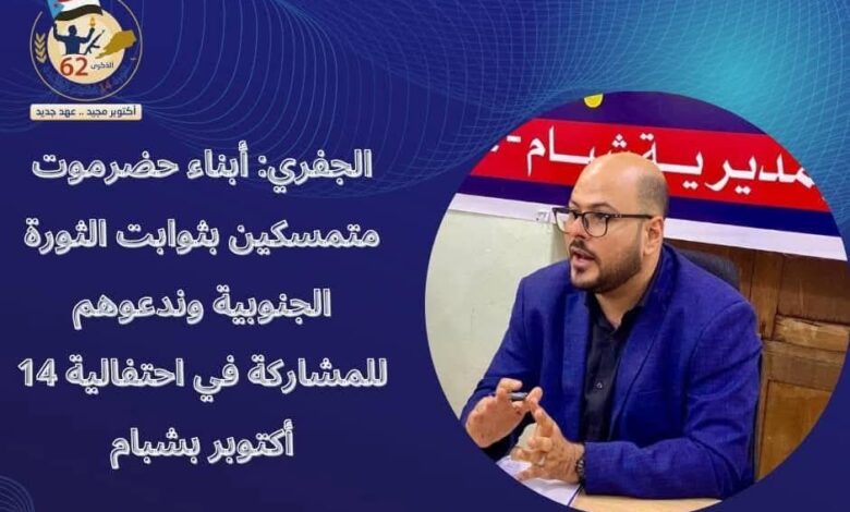 الجفري: أبناء حضرموت متمسكين بثوابت الثورة الجنوبية وندعوهم للمشاركة في احتفالية 14 أكتوبر بشبام