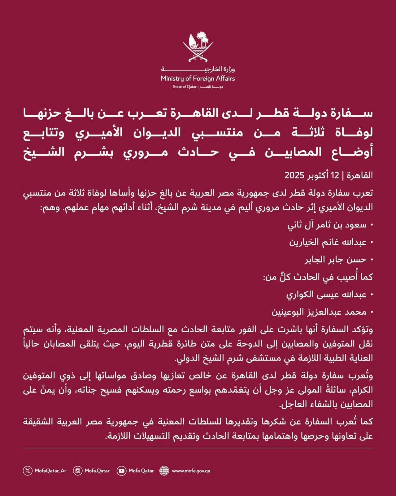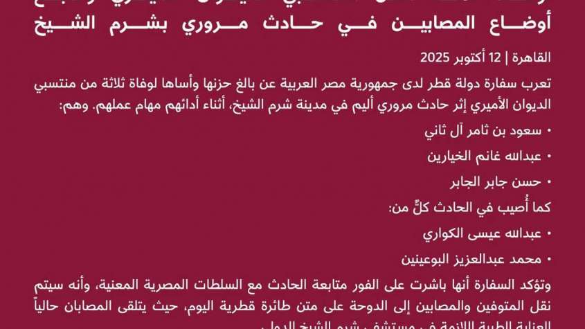 أعلنت سفارة دولة قطر لدى جمهورية مصر العربية اليوم الأحد، وفاة ثلاثة من منتسبي الديوان الأميري القطري في حادث مروري مؤسف وقع بمدينة شرم الشيخ، أثناء أدائهم لمهام عملهم الرسمية.