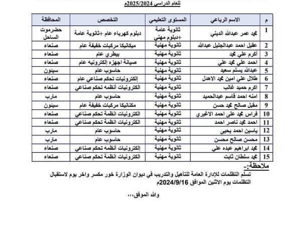 أعلنت وزارة التعليم العالي والبحث العلمي بعدن أسماء الفائزين بالمنح الدراسية المهنية في الجزائر للعام القادم.