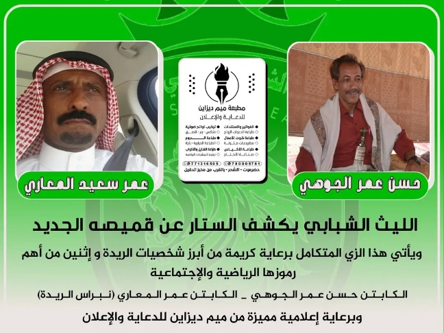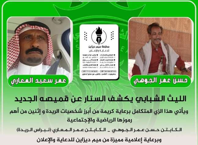 برعاية كريمة من أبرز شخصيات الريدة الاجتماعية والرياضية الكابتن حسن الجوهي والكابتن عمر سعيد المعاري وبرعاية إعلامية مميزة من ميم ديزاين للدعاية والإعلان … فريق الشباب يدشن طقمه الرياضي الجديد ..