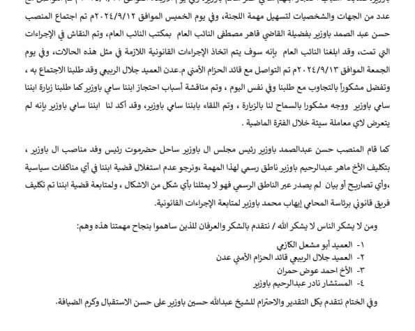 البيان اكد ان وفد ال باوزير الذي وصل الى عدن برئاسة المنصب الشيخ حسن عبدالصمد باوزير استطاع بيسر مقابلة عدة جهات مسؤولة فيما يخص قضية ابنهم ، كم سمح لهم بلقاء ابنهم في مكان احتجازه ، وحيث اكد لهم انه يتلقى معاملة حسنة و لم يتعرض لأي ايذاء ، كما شكر البيان تلك القيادات على ما بذلوه تجاه الوفد في تيسير اللقاءات بهم وبابنهم سامي .