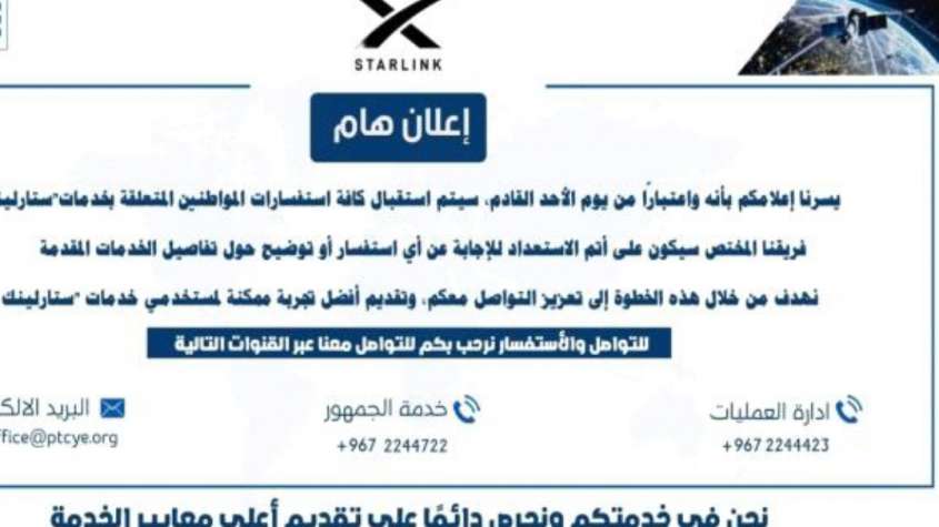 مؤسسة الاتصالات : إعلان بخصوص بشأن خدمة ستارلينك في عدن
