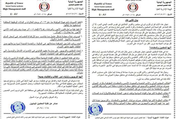 كما حملّت النقابة سلطة الحوثيين كامل المسؤولية عن الوضع الراهن بسبب سيطرتها على مؤسسات الدولة ونهب مقدرات الشعب وقطع المرتبات منذ ثمان سنوات، مطالبة المعلمين والتربويين في مناطق سلطة صنعاء على ممارسة حقهم القانوني في الإضراب الشامل والوصول إلى العصيان المدني.
