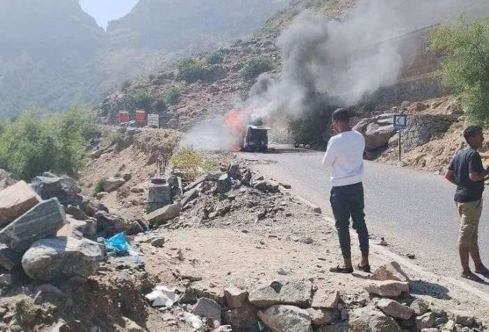 التهم حريق مفاجئ، اليوم، حافلة ركاب متوسطة في طريق هيجة العبد التابعة لمديرية المقاطرة بمحافظة لحج .