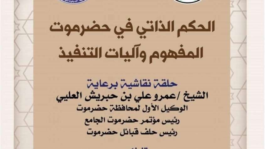 ينظم مؤتمر حضرموت الجامع السبت القادم في مدينة المكلا حلقة نقاشية بعنوان : «الحكم الذاتي في حضرموت المفهوم آليات التنفيذ».