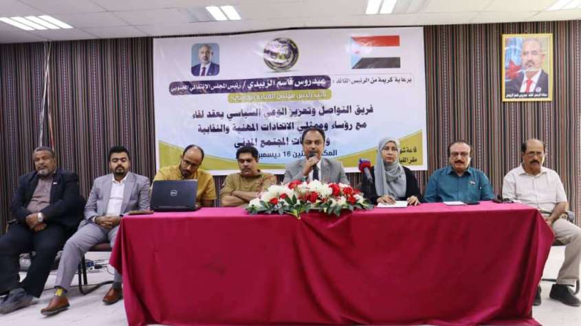 حضرموت:فريق التواصل وتعزيز الوعي السياسي بالمجلس الانتقالي يعقد لقاءً مع رؤساء وممثلي الاتحادات المهنية والنقابية ومنظمات المجتمع المدني