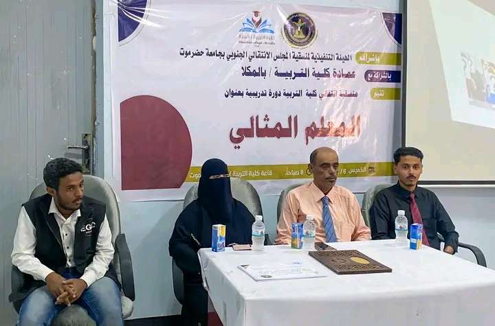 أقامت الهيئة التنفيذية لمنسقية المجلس الانتقالي الجنوبي بكلية التربية بجامعة حضرموت وبالشراكة مع عمادة كلية التربية بالمكلا، اليوم الخميس، دوره تدريبية بعنوان “المعلم المثالي” التي استهدفت طلاب كلية التربية