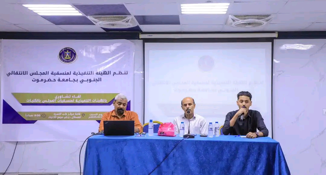 منسقيّة انتقالي جامعة حضرموت تعقد لقاءً تشاوريًا بالهيئات التنفيذية لمنسقيات المجلس بكليات الجامعة