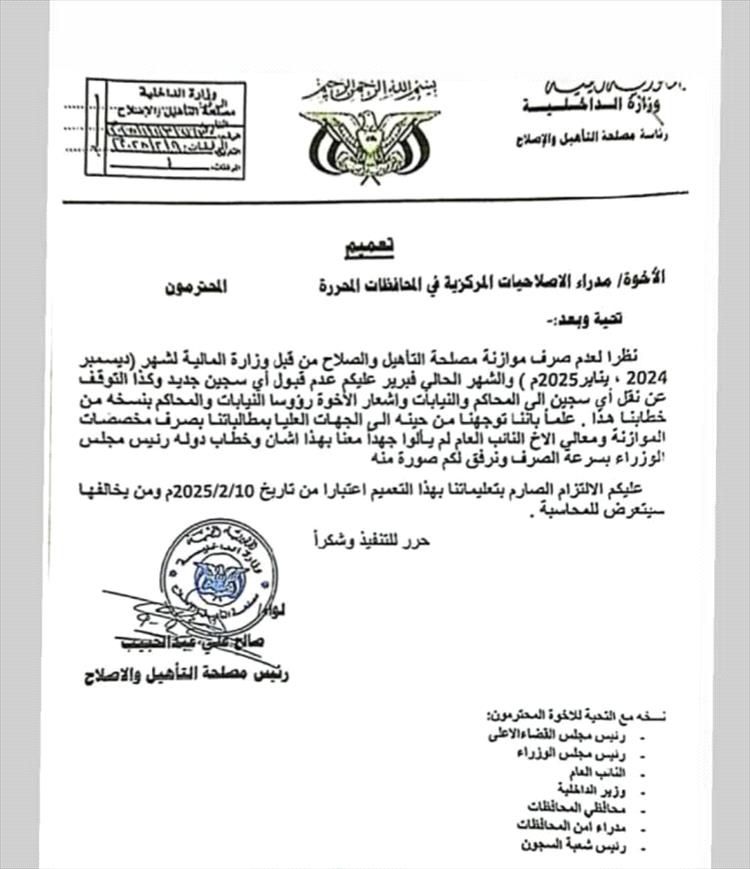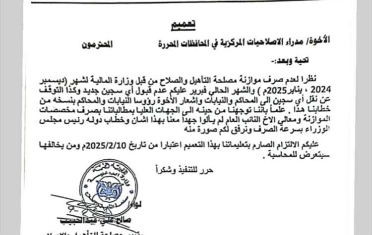 وأوضح الخطاب الموجه من رئيس مصلحة التأهيل والإصلاح (السجون) بوزارة الداخلية اللواء صالح علي عبدالحبيب، مدراء الاصلاحيات المركزية (السجون المركزية)، بإنه نظرا لعدم صرف موازنة التأهيل والاصلاح من قبل وزارة المالية لشهر ديسمبر 2024م، وشهري يناير وفبراير 2025م.