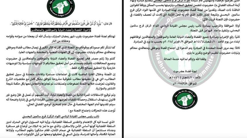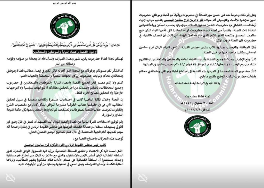 لجنة قضاة حضرموت ترحّب بمبادرة نائب رئيس مجلس القيادة الرئاسي “البحسني” لحل أزمة السلك القضائي بالمحافظة