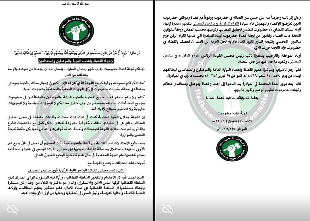 وأقرّت لجنة قضاة حضرموت، رفع الإضراب ومباشرة جميع القضاة وأعضاء النيابة العامة والموظفين والمتعاقدين لوظائفهم ابتداء من يوم الأحد ١٠ شعبان / ١٤٤٦هـ الموافق ٩ فبراير / ٢٠٢٥م بحسب ما ورد في المبادرة، على أن يتم الدعوة إلى اجتماع قضاة وموظفي ومتعاقدي محاكم ونيابات حضرموت بعد مرور المدة المحددة لتقييم الوضع وتقرير ما يلزم.